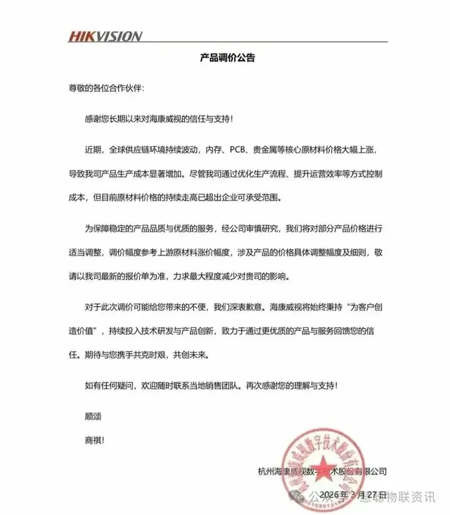 3月27日,海康威视与大华股份相继发布产品调价公告,引发市场关注。海康威视发布产品调价公告,表示受全球供应链持续波动影响,内存、PCB、贵金属等核心原材料价格大幅上涨,导致产品生产成本显著增加。公司经审慎研[详细]